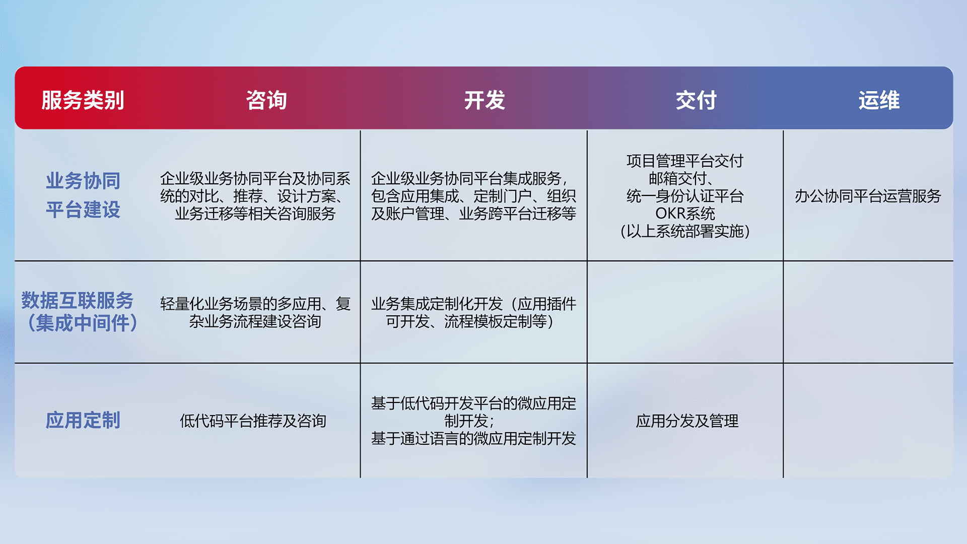 针对钉钉、、企微、、、IDaas等平台级产品提供产品的规划、、、方案、、、、交付、、定制化开发等服务,,,,实现如统一协同办公、、智能客户服务、、、、混合会议管理、、、、智能数据查询、、等业务场景,,,,实现数字化转型。。。。